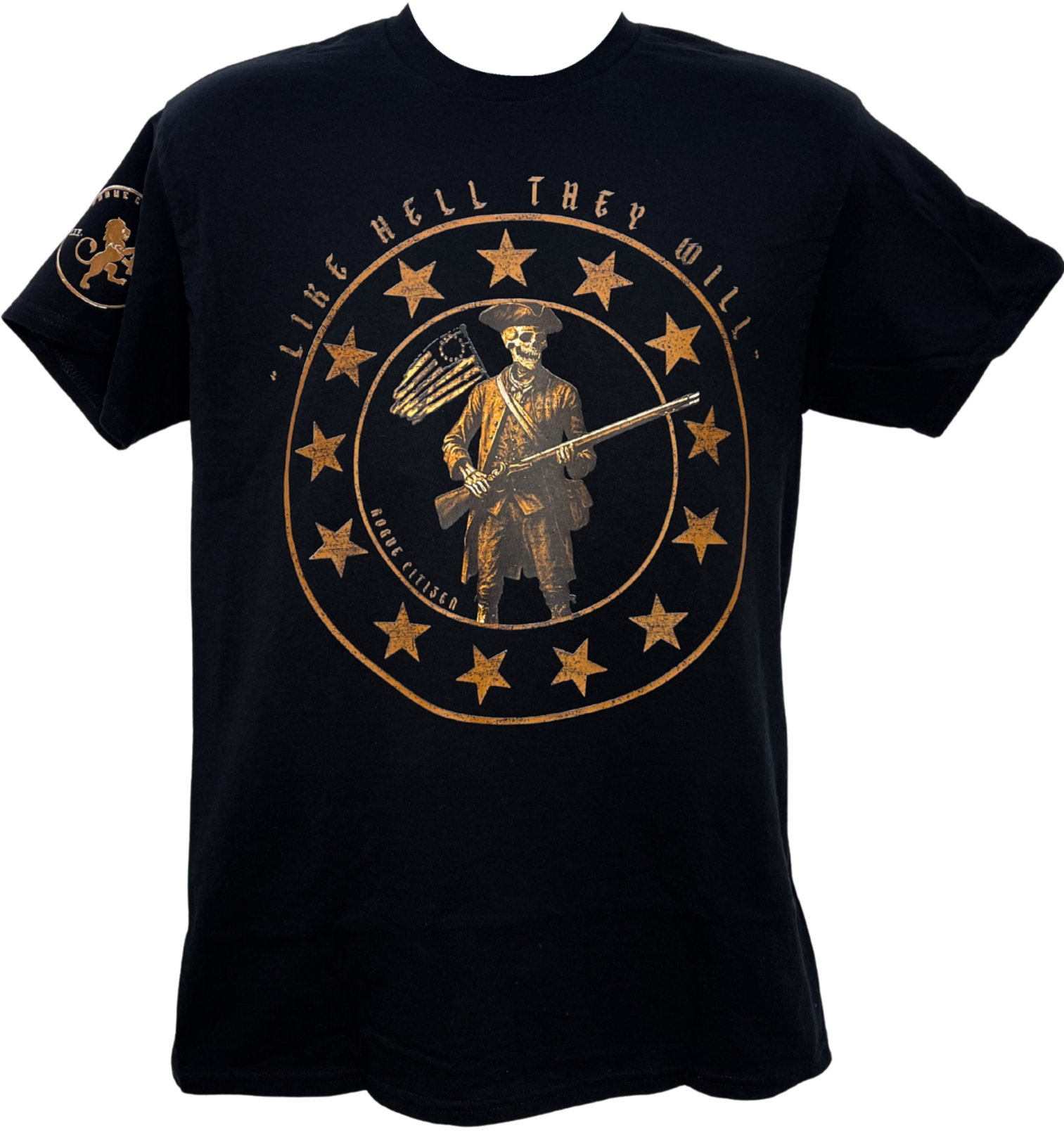 Heavy cotton, black short sleeve t-shirt. Design printed on the front and color matching logo on right sleeve of all products.