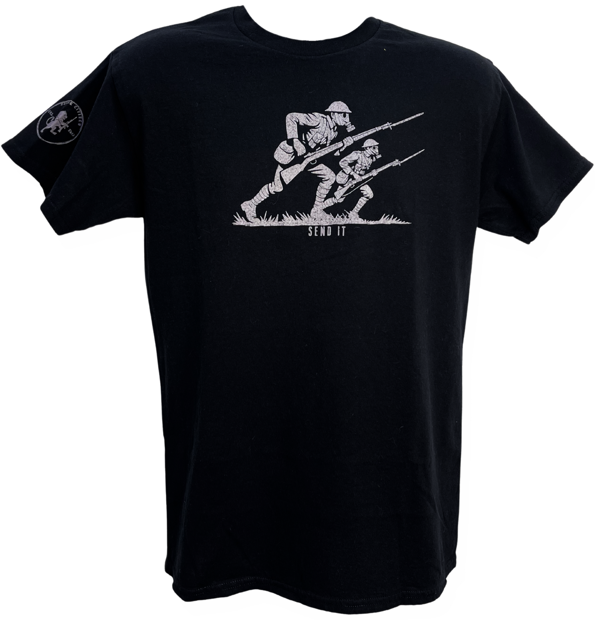 Heavy cotton, black short sleeve t-shirt. Design printed on the front and color matching logo on right sleeve of all products.